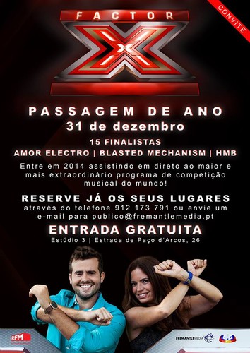 A SIC e a Fremantle estão a organizar a passagem de ano a 31 de dezembro que promete deixar marcas. Assim podes vir a entrar no ano novo assistindo em direto ao 'Factor X' e a ver ao vivo os 15 finalistas assim como os Amor Electro, Blasted Mechanism e os HMB tal como já havíamos noticiado AQUI.