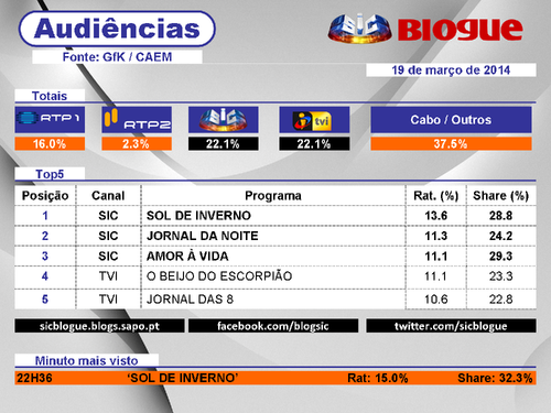 Audiências quarta, 19 março Hugo M Alves 20.03.14 Tags:amor à vidaaudiênciasficçãoinformaçãojornal da noitesol de inverno publicado às 11:34 link do post comentar favorito