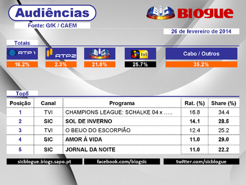 Audiências quarta - 26 fevereiro Hugo M Alves 27.02.14 Tags:amor à vidaaudiênciasficçãoinformaçãojornal da noiterodrigo guedes de carvalhosol de inverno publicado às 11:17 link do post comentar favorito